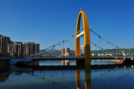 鄖西天河坪一橋為自錨式懸索橋,主跨2×50米。...